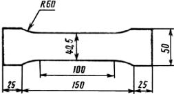 4.4. Для определения прочности и относительного удлинения при разрыве из образцов размерами 190´230 мм, прошедших определенное количество циклов испытаний, вырубаются при помощи штанцевого ножа три образца в форме двусторонней лопатки (черт. 4). Образцы испытывают на разрыв со скоростью 30 мм/мин.