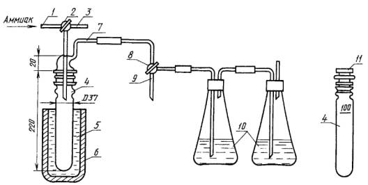 Жидкий аммиак поступает в пробоотборную пробирку 4, а выделяющиеся при этом пары аммиака абсорбируются раствором серной кислоты, находящейся в конических колбах 10.