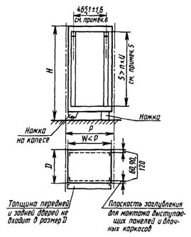 Размер ширины W < P и допуск на этот размер следует выбирать так, чтобы при установке шкафов в ряд был выдержан требуемый шаг.