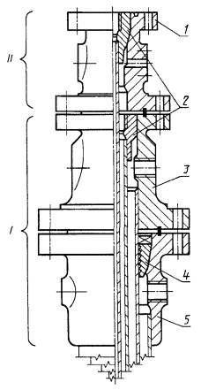 I - колонная обвязка; II - трубная обвязка; 1 - трубная головка (42); 2 - резьбовой трубодержатель (82); 3 - двухфланцевая колонная головка (9); 4 - клиньевой трубодержатель (81); 5 - однофланцевая колонная головка (8)