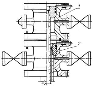 1 - фланец-трубодержатель (74); 2 - уплотнительная крестовина (71)