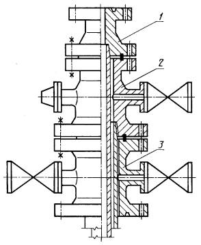 1 - катушка-трубодержатель (73); 2 - крестовина-трубодержатель (75); 3 - устьевая крестовина (70)