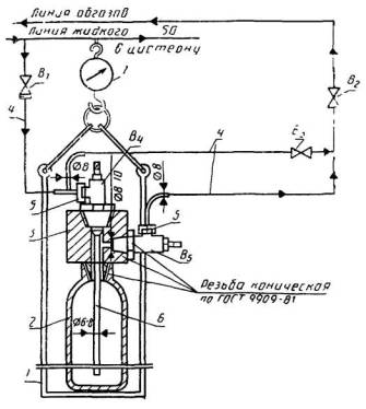 1 - корзина подвески баллона к динамометру; 2 - баллон; 3 - насадка для баллона; 4 - трубка для подсоединения баллона к линии жидкого сернистого ангидрида и линии абгазов; 5 - накидные гайки; 6 - сифон; 7 - динамометр; В1 и В4 - вентили для жидкого сернистого ангидрида; В2 и В5- абгазные вентили; В3 - вентиль для эвакуации сернистого ангидрида из линии жидкого сернистого ангидрида