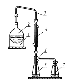 1 - колбонагреватель; 2 - круглодонная колба; 3 - переходная трубка; 4 - холодильник; 5 - насадка; 6 - приемная колба; 7 - контрольная колба