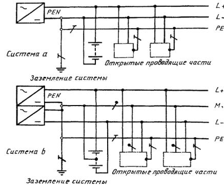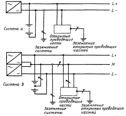 На рисунках 31А - 31Е даны примеры типов систем заземления для обычно используемых трехфазных сетей переменного тока. На рисунках 31F - 31К даны примеры типов систем заземления сетей постоянного тока. Используемые на рисунках буквенные обозначения имеют следующий смысл.