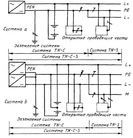 Питающие сети системы TN имеют непосредственно присоединенную к земле точку. Открытые проводящие части электроустановки присоединяют к этой точке посредством нулевых защитных проводников