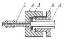 Соединение фторопластовое для реактора (рисунок 3), состоящее из: штуцера 1, накидной гайки 2, резиновой прокладки 3, муфты 4, кварцевого реактора с буртиком 5.
