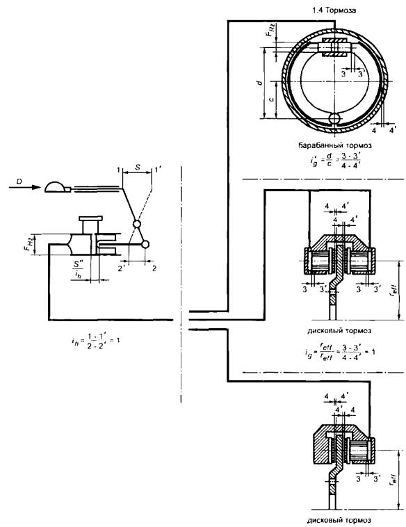 2.6 тормоз: Устройство, в котором возникают силы, противодействующие движению транспортного средства. Тормоз может быть фрикционным (когда эти силы возникают в результате трения двух движущихся относительно друг друга частей транспортного средства), электрическим (когда эти силы возникают в результате электромагнитного взаимодействия двух движущихся относительно друг друга, но несоприкасающихся элементов транспортного средства), гидравлическим (когда силы возникают в результате действия жидкости, находящейся между двумя движущимися относительно друг друга элементами транспортного средства); тормозом может служить также двигатель (когда эти силы возникают в результате искусственного увеличения тормозящего действия двигателя транспортного средства, передаваемого на колеса).