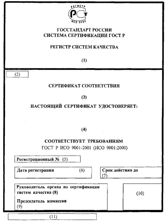 Прямоугольные поля на формате сертификата, обозначенные цифрами, носят условный характер и должны содержать следующие данные: