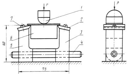 1 - пуансон; 2 - нож; 3 - самоустанавливающаяся опора с цилиндрическим основанием; 4 - стержень; 5 - опора с плоским основанием; 6 - образец; 7 - винт М5