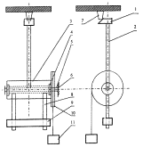 Диаметрально противоположно молотку к стальному цилиндру прикреплены две стальных ручки 8 с внешним диаметром 20 мм и длиной 185 мм. Ручки ввинчиваются в стальной цилиндр. На ручки устанавливается стальной противовес 9 таким образом, что можно сбалансировать вес молотка и противовеса. На конце стального цилиндра установлен ворот 10 шириной 12 мм и диаметром 150 мм, выполненный из алюминиевого сплава. На порот накручена нерастяжимая нить, один конец которой зафиксирован в вороте. На другом конце нити прикрепляется рабочий груз 11.