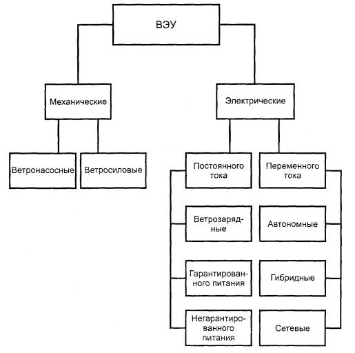 Общая схема классификации ВЭУ приведена на рисунке 1. Схемы классификации электрических ВЭУ переменного тока показаны на рисунках 2-4.