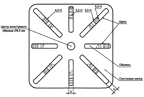 Очищают поверхность испытанного образца. Кладут маску на поверхность образца и помещают их на место осмотра в смотровой камере. Одно из отверстий маски устанавливается в положение, соответствующее 12 ч. Наклоняют под различными углами, не поворачивая образец или маску, и просматривают все отверстия невооруженным глазом.