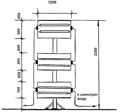 устанавливают в рабочей зоне 3 инвентарных секции шинопроводов и 11 установок инфракрасного обогрева (рис. 1, 2, 3) в виде стальных трубчатых электрических нагревателей (ТЭНов) типа НВС 1,2/1,6 (нагреватель воздушный сушильный) с параболическими отражателями (рис. 4, 5, 6, 7);