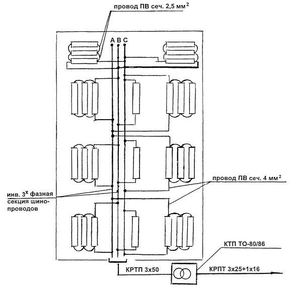 Рис. 9. Принципиальная схема подключения инфракрасных установок к КТП ТО-80/86