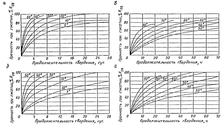 Рис. 11. Кривые набора прочности бетоном при различных температурах его выдерживания: