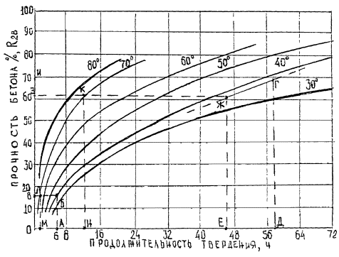 Определяем прирост относительной прочности при изотермическом прогреве за 12 часов как проекцию участка (точки «Л» и «К») кривой прочности при 70 °С (отрезок «ВЗ»), что соответствует 46 % R28.
