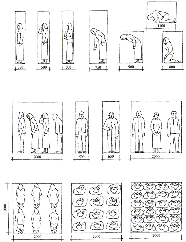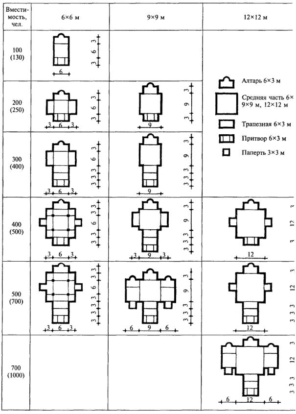Православные богослужения совершаются клириками и мирянами стоя, крестясь правой рукой (в некоторых случаях, держа в левой руке зажженную свечу), с поклонами, а иногда с коленопреклонениями, что следует учитывать при расчете необходимой площади храма требуемой вместимости (рис. 2). Сидеть разрешается только в редкие, определенные Уставом моменты службы, а также определенным категориям прихожан (больным, инвалидам). В притворе должны стоять оглашенные (готовящиеся к крещению) и кающиеся; в средней части храма - верные (крещеные христиане), в алтаре - священнослужители, на клиросе - певчие. Во время богослужения внимание молящихся обращено в основном в сторону алтарной преграды с иконами святых и в направлении движения священнослужителей. Ничто, ни элементы строительных конструкций - визуально, ни средства архитектурной декорации - эмоционально не должно мешать или отвлекать молящихся от совершающегося в храме богослужения.