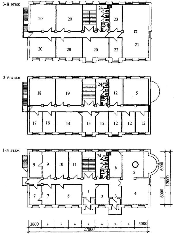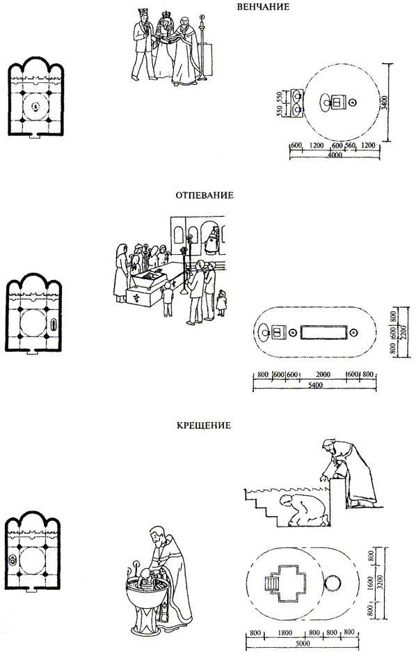 Частное богослужение совершается периодически по потребностям отдельных лиц, так называемые требы (чин крещения, венчания, погребения, освящение воды, молебны и др.). Каждое частное богослужение совершается по определенному чину и требует соответствующего пространства для размещения молящихся, священнослужителей, элементов церковной утвари (рис. 3). Чин крещения совершается в храме или крещальне; чин венчания - в храме; чин погребения, освящения воды, молебны - в храме или часовне; молебны и панихиды могут совершаться на открытом месте.