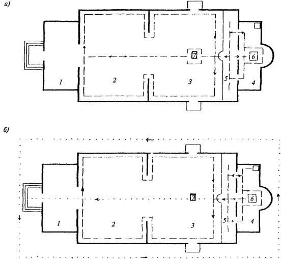 Рис. 4. Схема передвижения священнослужителей при всенощном бдении (а) и Божественной Литургии (б)