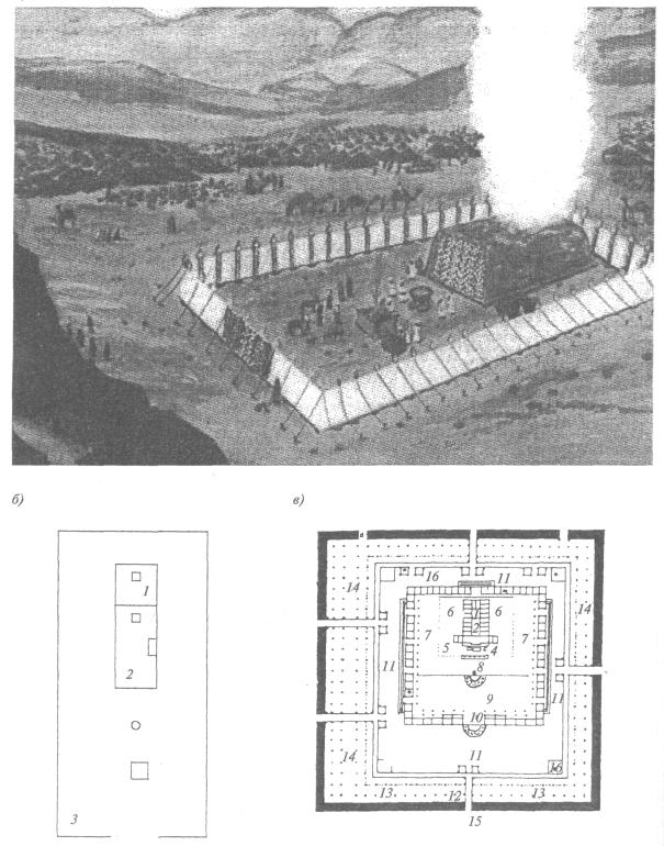 а - иконостас; б - план храма; 1 - алтарь; 2 - средняя часть храма; 3 - боковые приделы; 4 - притвор; 5 - паперть; 6 - престол; 7 - жертвенник; 8 - Горнее место; 9 - солея; 10 - амвон; 11 - место клироса