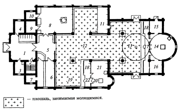 Как правило, храм состоит из трех основных частей: алтаря, средней части (собственно «храма» или помещения для молящихся) и притвора (рис. 1). Храм может состоять и из одного помещения, разделенного перегородкой-иконостасом на две части: собственно храм и алтарь, предназначенный только для священнослужителей.