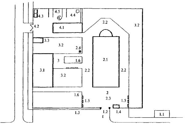 Движение священнослужителей по храму совершается в зависимости от вида богослужения. Схемы движения и остановок священнослужителей во время вечерни и Литургии приведены на рис. 4. Пути движения священнослужителей и места совершения ими богослужений вне алтаря должны учитываться при расчете площадей для размещения молящихся и вместимости храма.