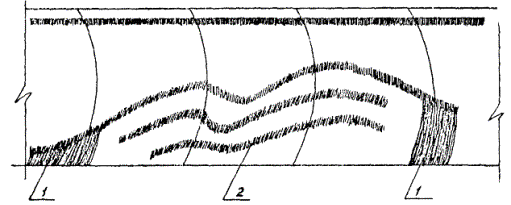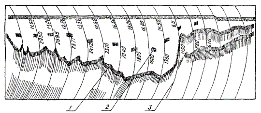 При работе через лед на ленте самописца из-за избыточного усиления обычно пишется не одна, а несколько линий, которые расположены подобно линии дна (рис. 7).