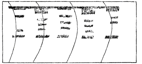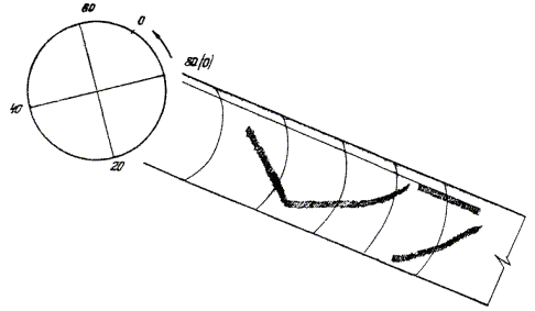 8.9. Для каждого скоростемера и профилографа палетка вычерчивается отдельно. В качестве основного деления палетки принимают 1 м, выраженный в установленном по результатам тарирования масштабе. Например, по результатам тарирования 1 м глубины выражается на батиграмме вертикальной ступенью высотой 2,2 мм. Следовательно, для построения палетки раствором измерителя, равным 2,2 мм, откладывают по дуге, описанной радиусом, равным радиусу вращения кругового пера профилографа, деления шкалы палетки через 1 м. При этом достаточно отложить 20 делений, что соответствует 20 м глубины. Наименьшее деление шкалы получают путем деления 1 м в вертикальном масштабе на две части. Таким образом, наименьшее деление шкалы палетки 50 см.