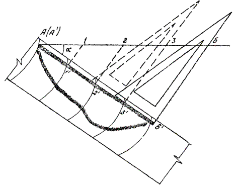 8.28. Первый способ переноса отметок на план осуществляют с использованием треугольника (рис. 8). Батиграмму с участком промера располагают под углом a к линии уреза на миллиметровой бумаге таким образом, чтобы при параллельном перемещении края треугольника можно было переносить промежуточные характерные точки промера 1, 2, и 3 на профиль, где в заданном масштабе нанесены с соблюдением измеренных в натуре расстояний промежуточные точки. Из точек профиля 1¢, 2¢ и 3¢ переносят с батиграммы глубины, используя при этом для измерения палетку.