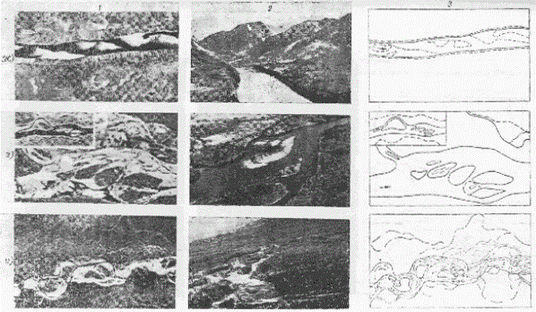 Высокая эффективность анализа руслового процесса в разных регионах нашей страны достигнута при комплексном рассмотрении материалов космических съемок (космического фотографирования), аэрофотосъемок и наземных обследований. Выполненные исследования позволили расширить применительно к горным странам типизацию руслового процесса, ранее созданную ГГИ, составить карту типов русел рек зоны БАМ и обобщить первый опыт работ института в этой области [9, 37, 40, 47].