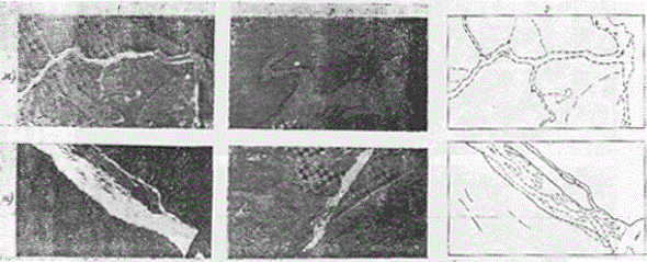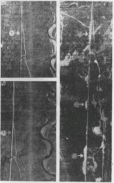 6. Значительную перестройку внутри русла можно обнаружить по снимкам участков рек с оставленными опорами разрушенных сооружений, топляками после молевого сплава леса и др. Изменения в русле, на пойме, на склонах выявляются по последовательным съемкам, а причины, вызвавшие их, - при наземных обследованиях.