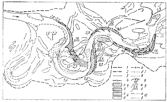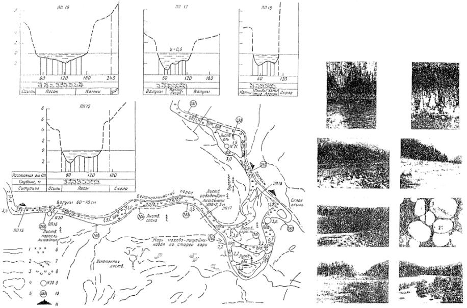 При проведении наземного обследования (морфологической съемки) в качестве основы можно использовать материалы аэрокосмических фотосъемок. При рекогносцировочном обследовании значительного по протяженности участка реки производится подбор контактных отпечатков вдоль всего маршрута в масштабах 1:20000-1:60000. Параллельно при обследовании используются схемы участка реки, представленные на планшетах или на кальке и выкопированные с фотосхемы. Снимки обеспечивают близкую к инструментальной привязку точек и линий на местности, по которой проводятся следующие работы: визуальное или полуинструментальное определение высоты (от уреза) всех морфологических образований; выделение зон намыва и размыва с определением размеров плановых деформаций (одновременно дается послойное описание вскрытых грунтов и фотографируется участок обрушений); отбор фотопроб донных наносов на пляжах, осередках; измерение по поперечникам глубин; определение скорости течения и размеров перекошенных ленточных гряд; точечные измерения в русле, на берегах, на пойме и др. [23, 38, 39]. Одновременно с указанными работами ведется: картирование растительного покрова на берегах, пойме и склонах; оконтуривание участков пожарищ и усиленного антропогенного воздействия; выявление способности растительного покрова к восстановлению; обозначение участков эрозионной опасности. В дневнике дается подробное описание всех наблюдений, включая мелкие детали, которые при камеральном дешифрировании могут послужить ключом к выявлению региональных особенностей. На основе фотосхем с одновременным использованием полученных при обследовании материалов и данных с топографических карт составляются гидроморфологические схемы, представляемые в схематичном плановом изображении и в виде совмещенных графиков по длине изучаемого участка реки (см. рис. 7, 8).