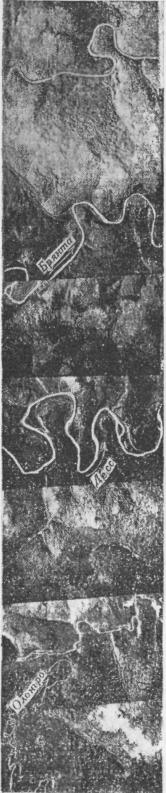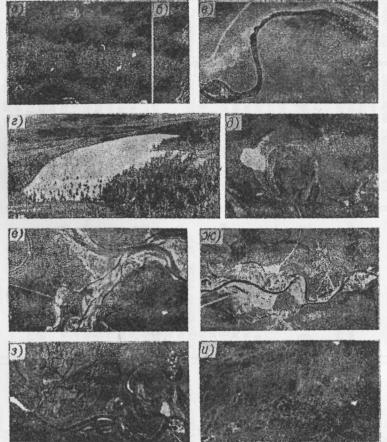 2. Значительные изменения, выявляемые по аэрокосмическим материалам, происходят в долинах, на поймах и в руслах рек после пожаров и вырубок, случавшихся в разное время, разной интенсивности и различных по охвату территорий (см. рис. 11а, б). Наиболее сильное влияние их па русловой процесс выявлено по материалам аэрокосмических фотосъемок в зоне многолетней мерзлоты (зона БАМ): в Верхнеангарской, Муйско-Куандинской и Верхнечарской котловинах, в левобережной части бассейна р. Зеи и бассейне р. Амгуни.