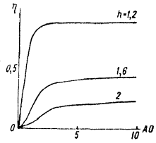 На рис. 1 приводятся зависимости величин аномалии (h) от разносов установок профилирования при различных глубинах залегания центра сферы h [3]. Указанные зависимости получены в отсутствие промежуточного слоя. Для комбинированного и симметричного профилирования с увеличением разносов значения аномалий очень резко возрастают, а затем медленно приближаются к асимптотическому значению, соответствующему величине аномалии в однородном поле; при h =1,2 асимптотические значения практически достигаются при разносах, равных 2. При наличии промежуточного слоя в виде проводящих наносов величина аномалии кажущегося сопротивления значительно уменьшается.