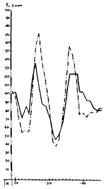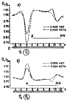 На рис. 2 показаны кривые симметричного электропрофилирования, полученные расчетным путем для случаев, когда шар залегает в среде, покрытой наносами (сплошная кривая), и без них (пунктирная кривая). Уменьшение амплитудных значений кажущихся сопротивлений над средой с наносами составляет 26,5 %.