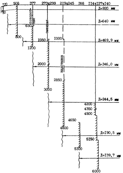2.1.8. В табл. 1.5 при проектировании нагнетательной скважины графы 1 - 3, 7 - 11 не заполняются. Если не предусмотрен перевод из эксплуатационной в нагнетательную скважину, то графа 4 не заполняется. В графе 5 записывается глубина спуска инструментов (приборов), начиная с максимальной, и для нее указывается максимальный диаметр спускаемого на эту глубину инструмента. Другие глубины приводятся в том случае, если спускаемые на эти глубины инструменты (приборы) имеют больший диаметр, чем у уже указанных в таблице инструментов (приборов).