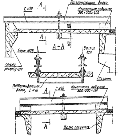 Покрытие резервуара выполнено из плоских сборных плит трапециевидной формы толщиной 120 мм, укладываемых по прямолинейным балкам П-образного сечения. В центре покрытия резервуара расположена центральная плита диаметром 6,7 м, состоящая из двух половин и опирающаяся на 4 колонны. Плиты и балки изготовлены из бетона М-300 повышенной плотности. Они армированы предварительно напряженной арматурой и сварными сетками. Швы между плитами замоноличены бетоном. Поверх покрытия уложена стяжка из бетона толщиной 40 мм.