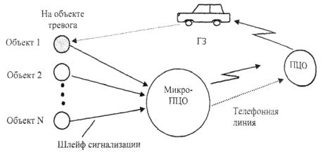 - совмещенную охрану. Сбор тревожных извещений осуществляется сначала в специально организованный микро-ПЦО* или пункт автономной охраны объекта, а затем по телефонной линии, радиоканалу, специально проложенной линии связи и т.п. тревожное извещение передается в ПЦО или по радиостанции непосредственно группе задержания. (К таким объектам относятся расположенные на общей охраняемой территории сосредоточенные объекты: коттеджные, дачные и садоводческие поселки, ГСК, торговые палатки на рынках, крупные автостоянки, квартиры в многоквартирных домах и т.п.);