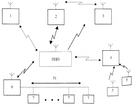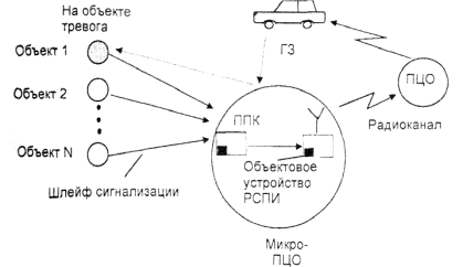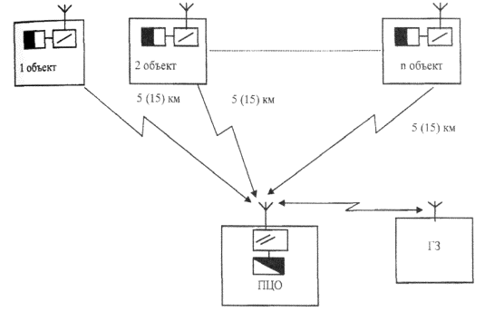 На рисунке Н.4 приведен вариант организации защиты объекта с помощью УО РСПИ. Групповой сигнал тревоги передается в ПЦО с помощью радиостанции. Указанный вариант рекомендуется использовать для больших удаленных объектов.