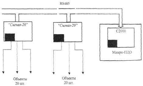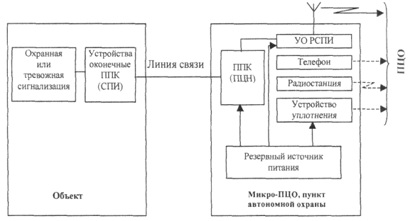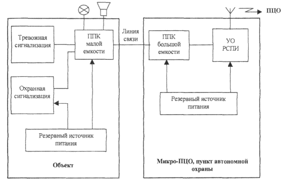 На рисунке Н.2 приведен вариант организации защиты объекта с помощью ППК малой емкости. Для блокировки применяют любой тип извещателей. Указанный вариант характеризуется выводом сигнала тревоги на внешние оповещатели и его запоминания на объекте. Сигнал тревоги фиксируется на ППК большой емкости, установленный в микро-ПЦО. Групповой сигнал тревоги передается в ПЦО с помощью УО РСПИ.