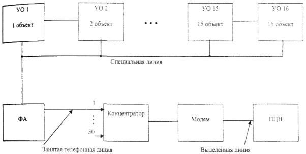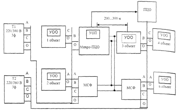 На рисунке Н.3 приведен вариант организации защиты объекта с помощью ППК «Сеть». Сигнал тревоги передается в микро-ПЦО по сети 220 В или по специально проложенной линии связи. Групповой сигнал тревоги передается в ПЦО с помощью устройства уплотнения по занятой телефонной линии.