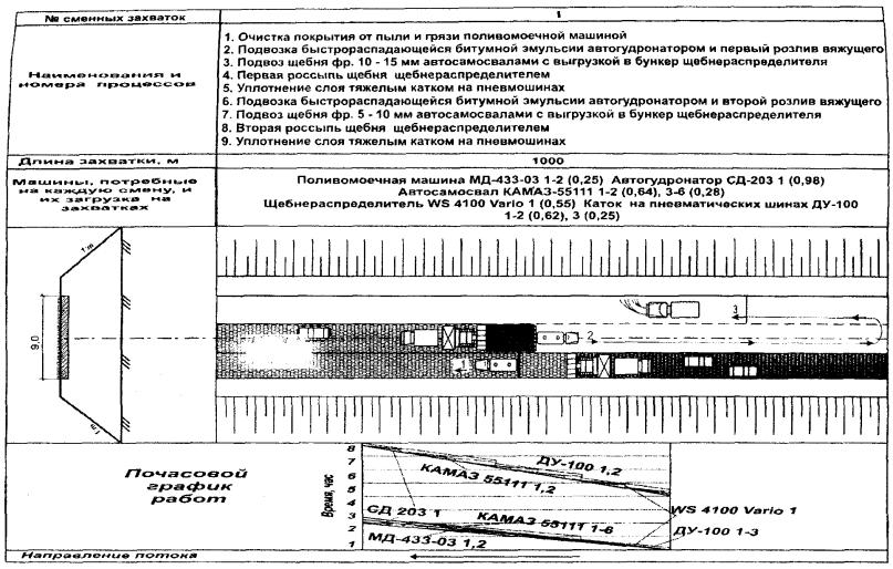 Технологические планы потоков по возведению насыпи и разработке выемок земляного полотна, устройству конструктивных слоев дорожных одежд и слоев износа содержат описание рабочих процессов в их технологической последовательности с указанием и расчетом потребных ресурсов, почасовыми графиками использования машин и механизмов и схемой организации их движения при производстве работ.