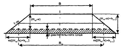 Примечание. Осредненный поперечник земляного полотна для участка линейных работ (рис. 1) предполагает возведение земляного полотна с присыпными обочинами. При этом насыпь отсыпают несколько шире (на «mx» с каждой стороны), чем предусмотрено проектной отметкой и ниже на величину «x»
