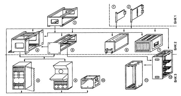1, 2 - ячейки; 3 - корпус блока; 4 - блочный каркас; 5 - корпус вставного блока; 6 - корпус блока (авиационного); 7 - корпус контейнера (авиационного); 8 - корпус шкафа; 9 - корпус пульта; 10 - корпус моноблока; 11 - корпус шкафа для выдвижной стойки; 12 - выдвижная стойка