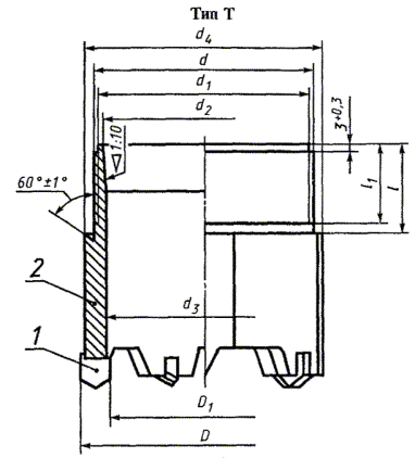 Основные размеры коронок должны соответствовать указанным на рисунках 1 и 2 (конструкция режущей части коронок изображена условно) и в таблице 1.