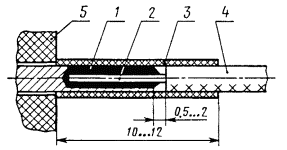 1 - припой; 2 - жила; 3 - изоляционная трубка; 4 - провод; 5 - соединитель