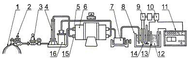 1 - баллон с кислородом (чистотой не менее 95 %) по ГОСТ 5583 (допускается использование кислорода из кислородопровода); 2, 3 - редукторы, понижающие давление кислорода; 4 - ротаметр с пневматическим регулированием подачи кислорода (от 0,2 до 2,0 дм3/мин); 5 - трубка огнеупорная муллитокремнеземистая, предназначенная для сжигания навески; 6 - трубчатая печь, обеспечивающая температуру до 1400 °С; 7 - фильтр-поглотитель, заполненный ватой для очистки продуктов сгорания от твердых частиц окислов; 7 - датчик экспресс-анализатора; 9 - электродная пара рН-метра; 10 - авторегулирующее устройство кулонометрического титрования; 11 - цифровое табло; 12 - анодный отсек датчика; 13 - целлофановая перегородка между датчиками; 14 - катодный отсек датчика; 15 - трубка огнеупорная муллитокремнеземистая, предназначенная для горячей очистки кислорода (при определении углерода с массовой долей более 0,03 % горячую очистку кислорода можно не применять); 16 - колонка, заполненная аскаритом для очистки кислорода от углекислого газа