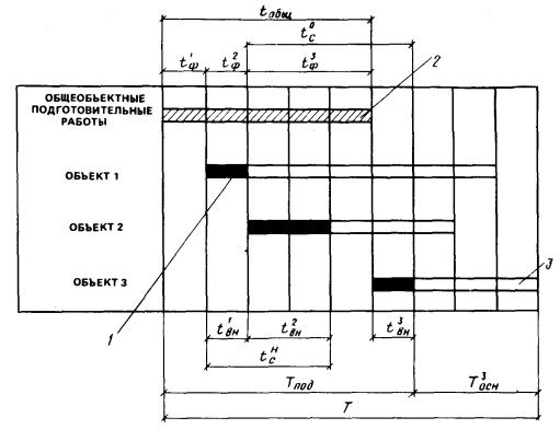 2.11 Следующим шагом при формировании вариантов организации работ по реконструкции является уточнение вариантов на основе информации об условиях строительного производства, включающей в себя данные об объемах строительно-монтажных работ и обеспеченности строительной организации трудовыми и материально-техническими ресурсами. Для обеспечения равномерного использования ресурсов строительной организации и непрерывности выполнения строительно-монтажных работ возможно использование поточных методов организации строительного производства с учетом некоторых особенностей, вызванных условиями реконструкции. Особенности организации реконструктивных работ заключаются в том, что после завершения строительно-монтажных работ на предыдущем объекте перемещение бригад и звеньев рабочих на следующий происходит в пределах объектов, входящих в этап реконструируемого предприятия. В пределах этапа реконструкции предприятия возможно допустимое технологией строительного производства варьирование ресурсами строительной организации в пределах