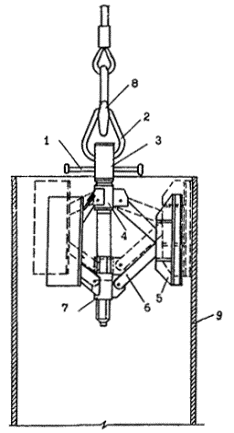 1 - ручка; 2 - строповочное звено; 3 - винт; 4 - муфта верхняя; 5 - колодки; 6 - звено; 7 - муфта нижняя; 8 - строп; 9 - труба мусоропровода
